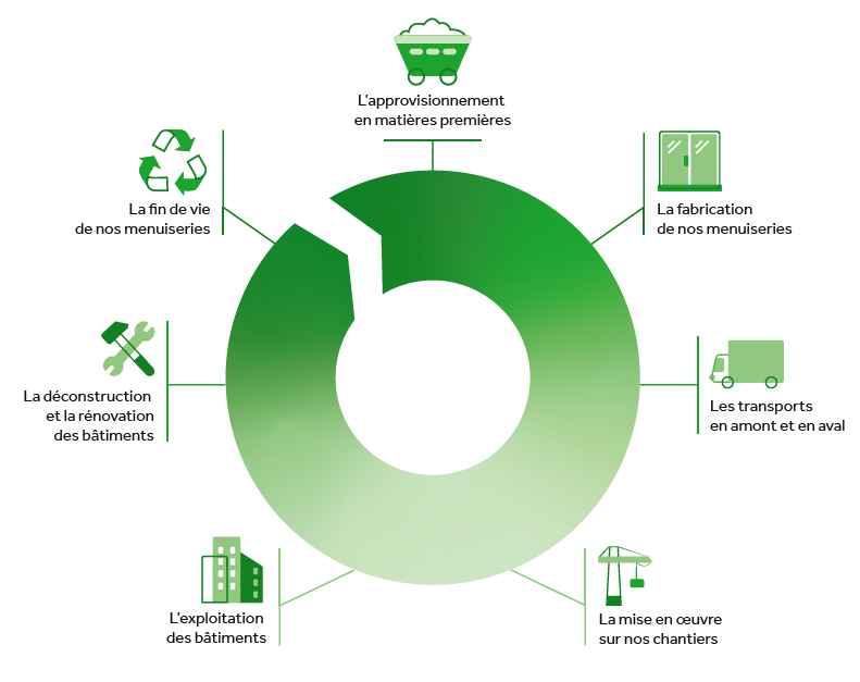 Le cycle de vie d’une menuiserie se décompose en 7 étapes majeures : approvisionnement en matières premières, fabrication, transports amont et aval, mise en œuvre sur les chantiers, exploitation dans les bâtiments, déconstruction et rénovation des bâtiments et enfin, fin de vie des menuiseries. Ce sont autant d’occasions d’agir grâce à l’implication quotidienne de tout notre écosystème : extrudeurs, transporteurs, fournisseurs, clients… Une somme d’interventions concrètes d’amont en aval, sur toute une chaîne de valeurs et non pas uniquement sur des produits ou des sites de production, qui permettent de s’inscrire dans un cercle vertueux. K•LINE et OUEST ALU s’engagent ainsi sur le traitement des déchets ou des emballages, sur les transports ou encore sur la fin de vie d’une menuiserie pour imaginer un avenir décarboné et des habitats plus vertueux.